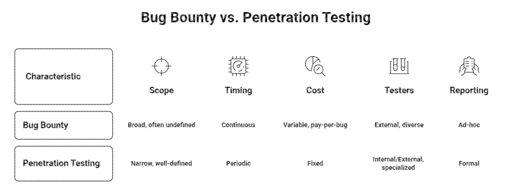 Continuity and scale forms the most significant point of departure between penetration testing and bug bounty. Penetration testing is an intermittent and time and budget-constrained activity. Bug bounty programs are open and reusable and can be operated by different researchers working on the same systems at the same time. It results in more extensive coverage and quicker vulnerability discovery. Another significant difference is cost structure. Penetration tests have initial payments whether successful or not. Bug bounty programs enable the companies to only pay per confirmed vulnerability, which is more efficient and result-oriented in security spending.