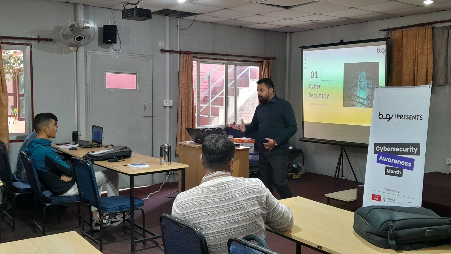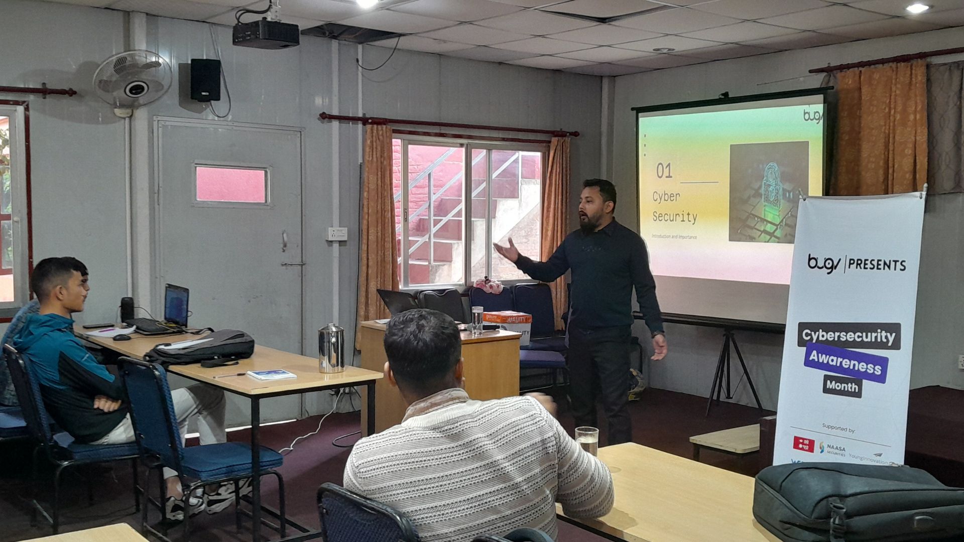 The event was honored by the presence of guest speaker Mr. Prashant Shrestha, CEO of YoungInnovations Pvt. Ltd. and Bugv’s esteemed partner in the initiative. Mr. Shrestha delivered a powerful presentation on the significance of cybersecurity in today’s digital landscape. He covered key theoretical concepts like the CIA Triad—Confidentiality, Integrity, and Availability—explaining how these three pillars are critical to maintaining secure information systems. His talk underscored that cybersecurity is not just about technology but about a commitment to continuous learning and adapting to new threats.
